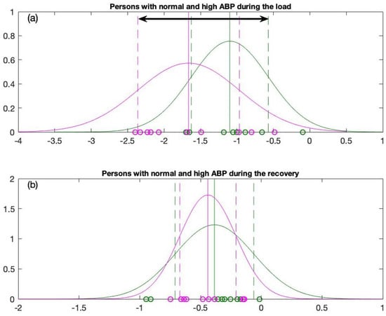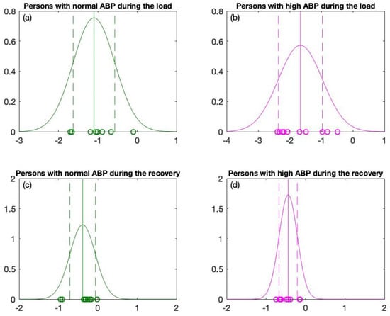 Next, the one sigma rule is applied to the distribution graphs for the load and the recovery data (the distribution of slope coefficients) in order to design a statistically meaningful classification algorithm between persons with high ABP and normal ABP. The data for persons with normal ABP are plotted in green; the data for persons with high ABP are plotted in magenta (Figure 5 and Figure 6). The means of the reconstructed Gaussian distributions are plotted with solid vertical lines. As mentioned previously, we will use one sigma rule. Therefore, the left end and right end of the variation interval are plotted in vertical dashed lines (see Figure 6a,b). One sigma rule is likewise applied to the recovery data with left and right ends of the variation interval equal to and accordingly (see Figure 6c,d).