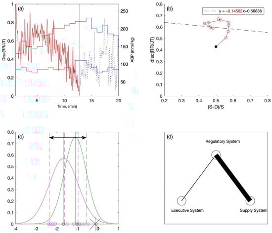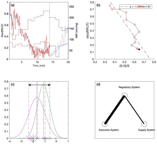 Figure 4a depicts the fluctuation in Disc (RR/JT) vs. time (in minutes) during the load and recovery process in an individual with high ABP. There is no early rise in Disc (RR/JT) as there would be in a person with normal ABP (Figure 3a). This indicates that the individual’s body is not attempting to rearrange its condition in order to find the optimal degree of bodily function organization during load, since the person is hypertensive. Figure 4b depicts the variations in systolic and diastolic ABP during the experiment during each minute of load and recovery in a hypertensive person. The phase plane representation of the arterial blood pressure’s relative pulse amplitude of (S − D)/S on the x-axis and Disc (RR/JT) on the y-axis throughout the load and recovery process is illustrated in Figure 4c,d. We observe the slope coefficients during the load and recovery process, which are “−2.2544” during the load and “−0.32312” during the recovery.
