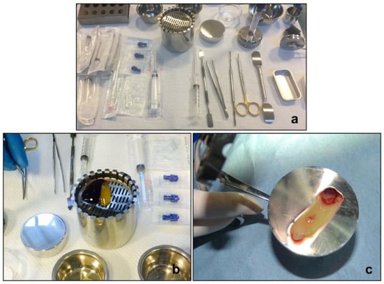 Concentrated growth factor (CGF) preparation. (a) Surgical instruments for CGF preparation; (b) CGF plus melatonin and (c) fibrin buffy coat pressed in a membrane.