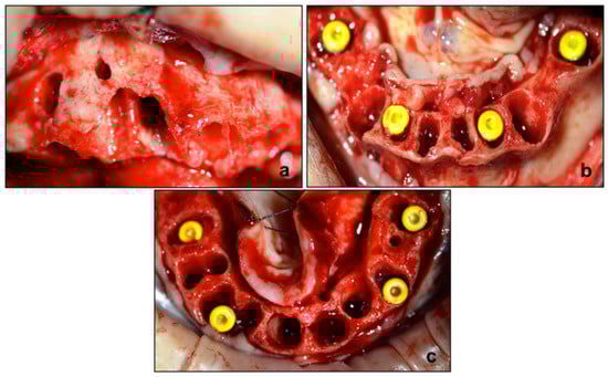 Intraoperative procedure. (a) Site preparation for Guided Bone Regeneration procedure and Max Stability implants positioned in the upper (b) and lower (c) jaw.