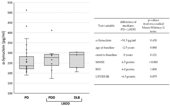 Due to the low case number in the demented diagnostic groups, group differences were only investigated between the non-demented PD patients (n = 28) and Lewy body diseases with dementia (LBDD = PDD plus DLB, n = 13). Although the median CSF levels of α-synuclein in PD (231 pg/mL) were lower (−51.5 pg/mL) than in LBDD (287 pg/mL), the difference was not statistically significant (p = 0.430). Similarly, the differences in age, disease duration, and BDI and UPDRS scores were not significant. Only the MMSE score was significantly lower in the LBDD group (p > 0.001), see Figure 1.