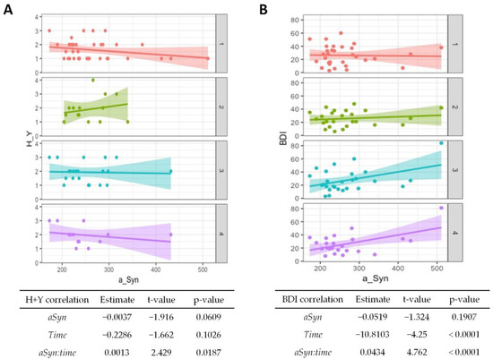 Association of α-synuclein with disease progression and affective symptoms in PD. Correlations from mixed linear regression are displayed by scatter plots with regression lines at baseline (1, red plot), 6 months (2, green plot), 12 months (3, turquoise plot), and 24 months (4, purple plot). Estimates, t-values, and p-values refer to the correlation of Hoehn and Yahr (H + Y) stage (A) and Beck Depression Inventory (BDI) scores (B) with α-synuclein (αSyn), changes in the stage/score over time (time), and to the correlation of baseline CSF α-synuclein with changes in stage/score over time (αSyn:time).