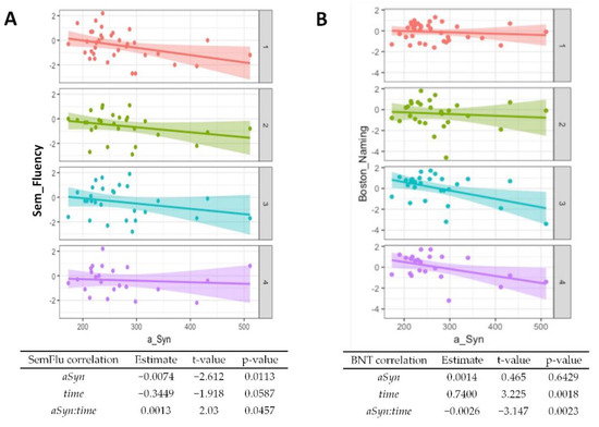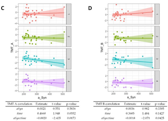 Association of α-synuclein with cognitive test performance. Correlations from mixed linear regression are displayed through scatter plots with regression lines at baseline (1, red plot), 6 months (2, green plot), 12 months (3, turquoise plot), and 24 months (4, purple plot). Estimates, t-values, and p-values refer to the correlation of results from the Boston Naming Test (BNT) (A), Semantic verbal fluency (SemFlu) (B), Trail Making Test A (TMT A) (C), and Trail Making Test B (TMT B) (D) with α-synuclein (αSyn), changes over time (time), and to the correlation of baseline CSF α-synuclein with changes in stage/score over time (αSyn:time).