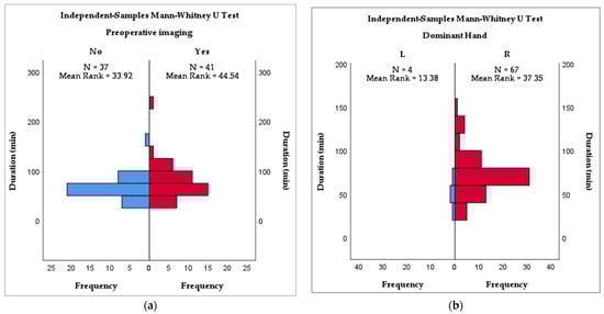 (a) Mann–Whitney analysis of preoperative imaging and duration of surgery (b) Mann–Whitney analysis of dominant hand of the surgeon and duration of surgery.