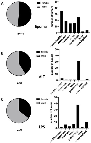 Gender distribution and body region distribution of lipomatous tumors. Section (A) of the figure gives an overview of gender and body region distribution of lipomata. Likewise, section (B) shows that more men than women were affected by ALTs, and by far, most ALTs were found in the pelvis/thigh region (n = 31). Section (C) depicts the results for LPSs. A total of 44 LPSs were identified in male patients, in contrast to 24 in females. The highest incidence per region was found in the pelvis/thigh region (n = 38).
