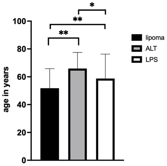 An LPS was diagnosed in 68 patients, with almost twice as many in men as in women (Figure 2C). Similarly to ALTs, most tumors were located in the pelvis/thigh region (n = 36). Moreover, two were found in the shoulder/neck region and six in the upper arm. In contrast, three LPSs were found in the lower arm and six in the torso. In two cases, the sarcoma was found in the knee region, and the lower leg/foot was affected in ten cases. On average, patients with sarcomas were 58.8 ± 17.5 years old. Therefore, they were significantly older than patients with lipomata (p = 0.007) and significantly younger than patients with ALTs (p = 0.04) (Figure 3). Average LPS volume was 681.5 ± 1148.3 cm3 when measured by MRI and 882.3 ± 1205.1 cm3 when measured in pathology. No statistical difference in volume was found when comparing MRI measurements with measurements in pathology. LPSs were significantly smaller than ALTs by MRI measurement (p = 0.011), but a statistical difference was not found between volumes measured in pathology.