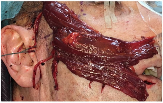 For vascular anastomosis, we chose the superficial temporal artery and retromandibular vein as donor vessels in four cases because of the good accessibility in the already-opened surgical site. In patient 1, these vessels were not preserved during previous surgery for parotid cancer. For this reason, we chose the facial artery and vein as donors.