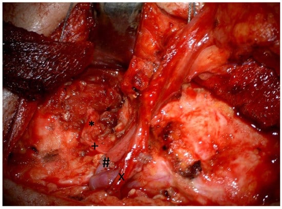 Operative situs on the right side after the completion of the nerve and vessel sutures using the superficial temporal artery and retromandibular vein. * marks the masseteric nerve, + marks the obturator nerve, # marks venous anastomosis, and x marks the arterial anastomosis.