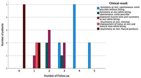 Trial-specific follow-up examinations were carried out every three to four months. Facial function was documented preoperatively and during the follow-up visits. The grading was carried out using the House–Brackmann scale (HB) and the Stennert Index []. The Stennert Index allows the grading of the resting face (0 for regular function to 4 for flaccid complete paralysis) and during voluntary movement (0 for no paresis and 6 for complete flaccid paralysis) []. As neither scale (the Stennert Index nor the HB Scale) was originally designed to evaluate facial symmetry after reconstruction, we used the Likert-like scale to evaluate the clinical outcome. Clinical outcomes were documented as follows: asymmetry at rest, flaccid paralysis; asymmetry at rest, minimal improvement of the muscle tone while biting; improved muscle tone and symmetry at rest while biting; symmetry at rest while biting, spontaneous smile possible; symmetry at rest, spontaneous smile without biting.