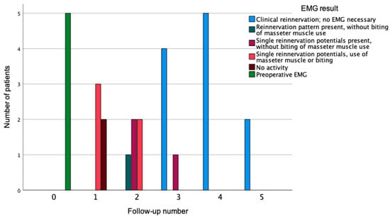 The functional outcomes and EMG results are summarized in Figure 3 and Figure 4, respectively. The first improvement of the musculature’s tone was detected at the first follow-up, after an average time of 3.1 (±1.0) months. At this stage, asymmetry at rest was still evident, and the masseter muscle was needed to increase the muscle tone by biting. Symmetry at rest was present on average at the time of the second follow-up visit after 5.6 (±1.4) months. All of the patients showed symmetry at rest and a spontaneous smile without the use of the jaw at the time of the fourth follow-up (average 10.8 (±1.8) months).