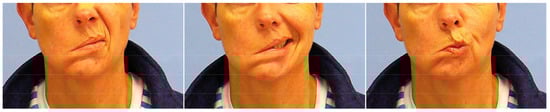 Preoperative excursion of the mouth in patient 4. Left: wrinkling the nose; center: smiling; right: pointing the mouth.