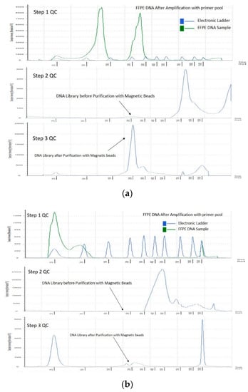 Figure 2. Three-step quality check of representative FFPE DNA samples. (a). Good on-target coverage DNA sample QC on TapeStation. (b) Poor on-target coverage FFPE DNA sample qc on TapeStation. Figure 2 shows a three-step quality check (QC) of representative FFPE DNA samples showing good and poor coverage on TapeStation, respectively. Step 1: QC after amplification with DNA primer pool, Step 2: QC after index adapter ligation to the amplified DNA sample, Step 3: Final library after purification with magnetic beads. The good coverage samples (a) had DIN: 5.9, DNA concentration: 110 ng/µL, library concentration: 170 nmol, average library size (bp): 230, coverage: 804×. The poor coverage sample (b) had DIN: 2.3, DNA concentration: 2.5 ng/µL, library concentration: 2.12 nmol, average library size (bp): 253, coverage: 3.5×.