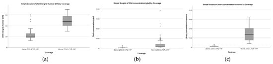 Figure 3. Graphical representation of parameters in FFPE DNA samples according to NGS coverage. (a): DIN, (b): DNA concentration, (c): DNA library concentration (Left to right). Figure 3 shows a box plot of FFPE DNA sample coverage with respect to parameters such as DIN, DNA concentration, and library concentration. All the parameters show a significant difference between the poor coverage (below 250× and 10% VAF) and good coverage (above 250× and 10% VAF). * represents the extreme data points, ◦ represents the ouliers data points.