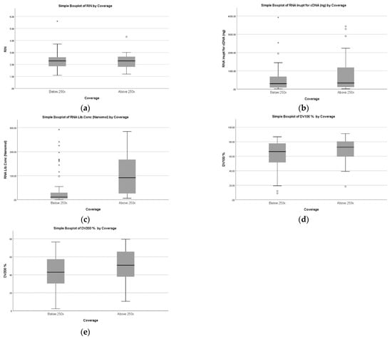 Figure 4. Graphical representation of FFPE RNA samples according to NGS coverage. (a): RIN, (b): RNA input for cDNA, (c): RNA library concentration, (d): DV 100, (e): DV 200 (Left to Right). The figure describes a box plot of FFPE RNA samples coverage with respect to parameters such as RIN, RNA input for cDNA, RNA library concentration, DV 100, and DV 200. Only RNA library concentration (nanomol) was found to be significantly different between poor coverage (below 250×) and good coverage (above 250×). * represents the extreme data points, ◦ represents the ouliers data points.