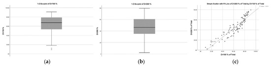 Figure 5. Graphical representation of overall distribution value (dv) in FFPE RNA samples. (a): DV100 (Overall) (b): DV 200 (Overall) (c): Correlation between DV100 and DV200 (Left to Right). (a,b) describe the box plot of DV 100 and DV200 for RNA samples in the study. (c): The correlation between DV100 and DV200 for RNA samples in the study. ◦ represents the ouliers data points.