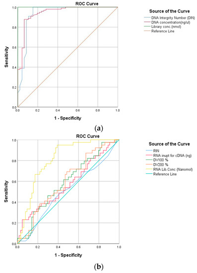 Figure 6a,b shows the receiver operating characteristic (ROC) curve analyses of pre-analytical and post-analytical parameters for DNA and RNA. For DNA, pre-analytical parameters are DIN and DNA concentration (ng/µL) while for RNA, RIN, RNA input for cDNA (ng), DV100, and DV200 are the pre-analytical parameters. The post-analytical parameter for DNA and RNA is library concentration (nanomole).
