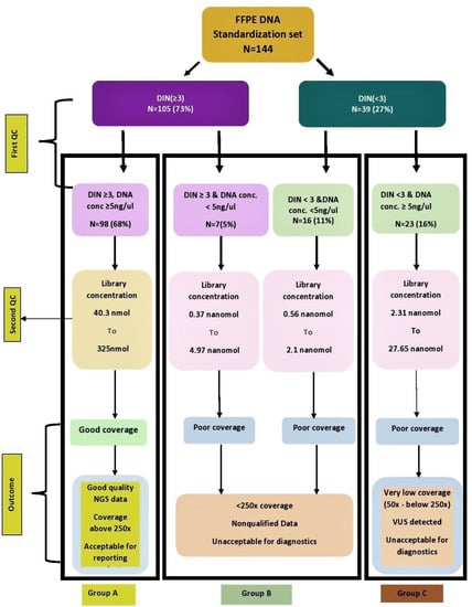 Based on the overall study of FFPE samples and the statistical analysis, a decision tree for DNA was established. This provided better predictive values of parameters such as DIN, DNA concentration, and library concentration while implementing targeted NGS in diagnostic settings (Figure 7).