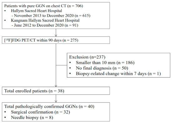 - Hu, L.; Pan, Y.; Zhou, Z.; Gao, J. Application of Positron Emission Tomography-Computed Tomography in the Diagnosis of Pulmonary Ground-Glass Nodules. Exp. Ther. Med. 2017, 14, 5109–5113. [Google Scholar] [CrossRef][Green Version]