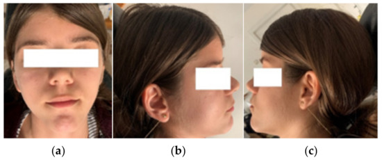 Front (a), right (b), and left (c) profile photos of the patient.
