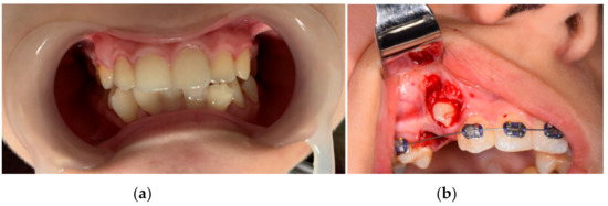 Intraoral photos in occlusion (a) and from the surgical intervention (b).