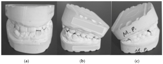 Patient’s plaster study models: (a) front image, (b) left-side image, (c) right-side image.
