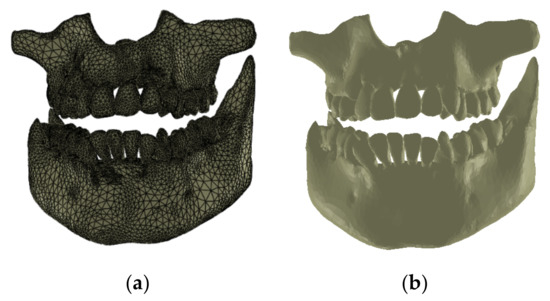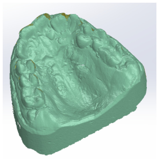 Finally, we applied other reverse engineering operations to the model. The final model of the dental structure containing 156,042 elementary triangular surfaces is presented in Figure 10.