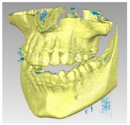 To obtain the final model, 30 successive scans were performed. Then, we obtained the final model of the scan operation. Figure 5 shows the common point cloud of the upper and lower images, which represents the raw, unprocessed model of the scanned maxillary.