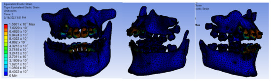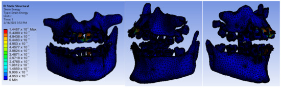 Analyzing the result maps obtained from the study, we concluded that the maximum mechanical displacements were 9.9617 × 10−7 m (0.996 microns), particularly on the incisors. The maximum deformations were 0.00015801 and were found, in particular, on the contact surfaces between the bracket- or tube-type elements and the teeth. The maximum stress was 1.0595 × 107 Pa and observed on the incisors and the contact surfaces between the brackets and the teeth. The deformation energy was 1.4487 × 10−8 J and found, in particular, on the incisors. However, further experimental studies are needed to deepen the results obtained.