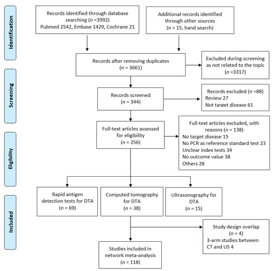 Systematic search identified a total of 3992 articles from electronic databases (PubMed, 2542; Cochrane, 21; and EMBASE, 1429). After exclusion of 346 studies containing overlapping data or appearing in more than one database and after screening the titles and abstracts, 3317 studies that did not meet the inclusion criteria were excluded. After intensive screening, an additional 88 papers that did not contain original data or target diseases were eliminated, leaving 256 studies eligible for intensive screening. Of the remaining studies, 138 were further excluded for the following reasons: no target disease (n = 15), no RT-PCR as the reference standard (n = 23), unclear index tests (n = 34), no outcome value (n = 38), and others (n = 28). Finally, 118 studies including 69445 participants met our selection criteria for NMA, among which 69 RDT, 38 CT, and 15 US were included in the pairwise meta-analysis for DTA. There was overlap in the design of four 3-arm studies between CT and US (Figure 1).