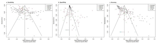 Figure 5 shows the results of publication bias or small-study effect in the 118 studies included in NMA. In all summary statistics, individual studies of CT and US were symmetrically distributed with respect to combined effect size and standard error of the graph. However, the distribution of RDT studies was scattered asymmetrically, especially sensitivity, NPV, and accuracy. Thus, RDT was estimated to have a publication bias in this NMA (Figure 5).