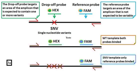 Unfortunately, no guidelines about ddPCR setting are today available; nevertheless, the progressive dissemination of this technique in many laboratories prompted the scientific community to produce two useful documents for producing high-quality assays: the ISO 20395:2019 rules (available at the website https://www.iso.org/obp/ui#iso:std:iso:20395:ed-1:v1:en, accessed on 28 February 2022) and another work that summarized the minimum information for publication of ddPCR experiments (dMIQE guidelines) [13]. In this paper, several technical aspects of ddPCR are discussed: amplicons <150 bp are preferred, the fundamental role of perfectly setting annealing temperature and probe concentrations, the pre-amplification step for low-level targets or the dilution step for too concentrated samples. Finally, the rules for adequately placing the threshold that allows distinguishing positive events from the background and the best number of replicates to do. Moreover, a further application of ddPCR also includes the multiplexing ddPCR [13]. In this case, different fluorescent probes are simultaneously detected in different channels or, in the “higher order multiplexing” version, it is possible to evaluate different targets by varying the concentrations of different probes using the same fluorophore. This most recent version of ddPCR can be also performed by combination of more than one fluorophore with different probe concentrations, to detect up to 4 targets within a single reaction [1,14,15] (Figure 2). During the recent pandemics, the multiplexing ddPCR has been used to simultaneously detect the Coronavirus envelope, the viral RNA polymerase and the nucleocapsid genes, so avoiding the possible mismatch of primers and probes which could follow the virus changes that might lead to false negative results [16].
