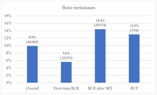 In our study, the prevalence of bone metastases at PET imaging varied among different clinical settings, with lower rates for first-time BCR (5.6%), compared to BCR after SRT and BCP cases (14.4% and 13.0%, respectively). These results are in accordance with previous PSMA-PET studies, which documented different rates of overall positivity [11,23,24,29] and distant metastases (M1a/b/c) [23,24,29] among clinical settings, with first-time BCR representing the most favorable subgroup. At logistic regression analysis, our data showed clinical setting to be an independent predictor of skeletal involvement, with BCR patients previously treated with SRT on prostate-bed being at higher risk of bone metastases, compared to the first-time BCR patients (OR: 2.90; 95% CI: 1.32–6.35; p = 0.008). The higher incidence of bone metastases in post-SRT BCR patients is not surprising since these patients have already experienced a recurrence and have already failed a previous line of treatment. Regarding the BCP setting, only a marginal significance (p = 0.066) was found at univariate analysis. However, considering the high prevalence of bone metastases in this subgroup (13% vs. 14.4% in BCR after SRT cases), this result might be biased by the significantly lower sample size (n = 54 vs. 174 BCR after SRT vs. 215 first-time BCR). Moreover, it is possible that the T stage and PSAdt determined a confounding effect on the BCP setting, due to the higher prevalence of T stages ≥ 3a in this subgroup (66% vs. 51% in BCR after SRT vs. 54% in first-time BCR), and the lower PSAdt (3.4 months vs. 9.0 in BCR after SRT vs. 8.3 in first-time BCR). The hypothesis of a predictive role of BCP in bone recurrence is supported by previous studies by Ferdinandus J. et al. [30], Meijer et al. [31] and Farolfi et al. [32], in which high proportions (40%, 39%, and 33%, respectively) of BCP patients were found to already have distant metastatic localizations (≥miM1) at PSMA-PET. Moreover, in 2015 Bianchi et al. [33] already reported skeletal/visceral metastases to be the first site of recurrence in up to ~50% of BCP patients with a history of node-positive PCa treated with RP and extended pelvic lymph node dissection (ePLND).