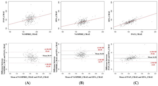Table 2 shows the mean absolute value and standard deviation of the CRAE, CRVE, and AVR measurements derived from VAMPIRE, IVAN, and SIVA for the 223 images. The agreement between values computed using VAMPIRE, IVAN, and SIVA is described by scatterplots and Bland–Altman plots (Figure 2, Figure 3 and Figure 4).