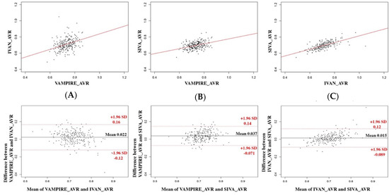 Agreement between each software for AVR. The three software applications are compared two by two: (A) IVAN and VAMPIRE, (B) SIVA and VAMPIRE, (C) SIVA and IVAN. Scatterplots are represented above with regression lines; Bland–Altman plots are represented below.