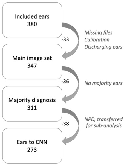 To prepare for the CNN analyses, a new grouping of diagnoses was made into three basic screening categories: Normal, Pathological (AOM, OME and CSOM) and Wax. Cases with the diagnosis NPD could not be classified into any of these categories and were therefore transferred to a separate group for later sub-group analysis (Figure 1). The previously chosen single best image from each of the remaining 273 GIF files constitute dataset 1 (see below).