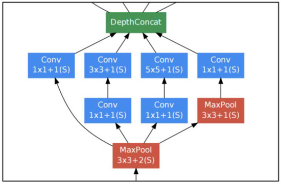 The CNN that was used is known as Inception v1, also known as GoogLeNet, reported in Szergedy et al. [25]. This CNN model is available to freely use as part of Google’s Tensorflow platform. It consists of 22 layers made up of various convolution, pooling, and dense layers. It also makes use of a so-called “inception module” to assist with dimensionality reduction in the shallow layers in order to ease computation in the deeper layers.