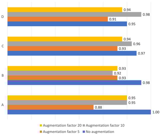 Overall accuracy. Overall accuracy for the convolutional neural network for scenarios (A–D) for augmentation factors 0, 5, 10 and 20. (A): training and testing on dataset 1, (B): training and testing on dataset 1norm, (C): training on dataset 1 and dataset 2 combined and testing on dataset 1, (D): training on dataset 1norm and dataset 2norm combined and testing on dataset 1norm.