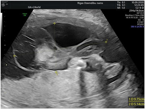 A 28-years-old woman, gravida 2, para 1, was referred to Riga maternity hospital Fetal medicine unit for the second opinion at 24 weeks of gestation. Woman had previously vaginal delivery, complicated by manual placental ablation. She had an otherwise uneventful medical history and denied smoking, use of alcohol, illicit drugs or medications. Detailed ultrasound examination showed a single anatomically normal fetus, with appropriate for gestational age biometric measurements. During the examination the multilocular solid tumor measuring 9.6 × 7.8 × 6.7 cm (265.993 cm3) at the middle portion of the umbilical cord was observed (Figure 1). The differential diagnosis comprised umbilical cord teratoma and angiomyxoma.