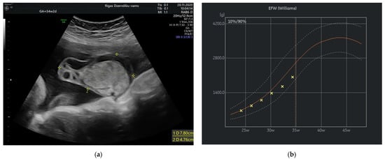 (a) Tumor appearance at 34 + 2 weeks; (b) Growth chart, estimated fetal weight by weeks.