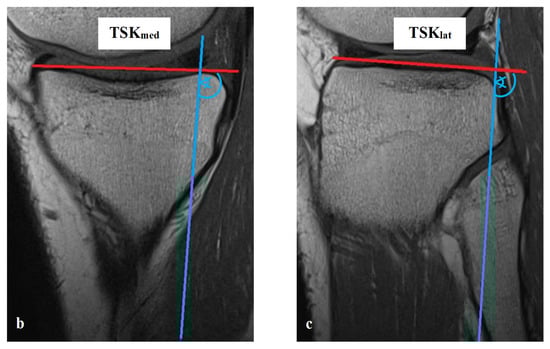 Exemplary depiction of the measurements of the tibial slope according to Karimi et al. [37] for medial (TSKmed, (b)) and lateral (TSKlat, (c)) knee-joint surface: The measurements of TSK were performed in sagittal view of the knee joint in MRIs. To determine the right position of the dorsal tibial bone cortex for each TSKmed and TSKlat, a reference line was set in the best available image (a). Based on this reference line, the dorsal inclination angle of the tibial plateau was determined in the medial (TSKmed, (b)) and lateral (TSKlat, (c)) joint sections.