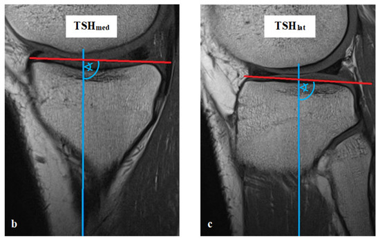 The TS is of enormous importance for the biomechanics of the knee joint, especially for tibial translation and general knee-joint stability [7,10,11]. Subsequently, the TS is of major relevance for both knee-joint-preservation and knee-joint-replacement surgical therapy of knee-joint pathologies [8,12,13]. Therefore, it is necessary to radiologically record the TS in the best possible way and to create valid reference values in order to reconstruct the physiological TS in the best manner on the basis of these data [23,24,25]. In order to be able to exactly record both the medial and lateral TS, we examined MRIs in the present study to establish reference values for future therapeutic applicability.
