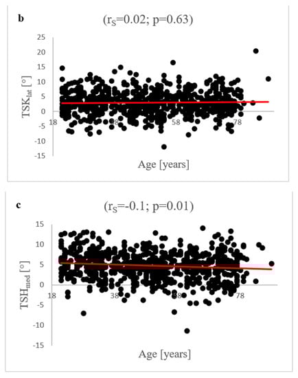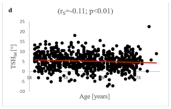 Correlation analysis between patients’ age and TSKmed, TSKlat, TSHmed and TSHlat: There was no significant Spearman correlation between TSKmed (a)/TSKlat (b) and patient age (TSKmed: rS = 0.05; p = 0.15; TSKlat: rS = 0.02; p = 0.63). The analysis detected a significant correlation of TSHmed (c) and TSHlat (d) with patient age. A rS of −0.1 (p = 0.01) was found in the case of TSHmed and a rS of −0.11 (p < 0.01) in the case of TSHlat.