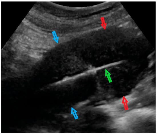Transabdominal ultrasonogram of the uterus and core needle biopsy of the uterine lesion. The red arrows indicate the uterine lesion (in the uterine doom myometrium); blue arrows indicate the uterine corpus; the green arrow indicates the automatic biopsy system in the uterine cavity. The core needle is activated into the uterine myometrium lesion.