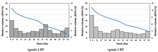 Figure 3 shows the dose distribution, cDVH curve, and dDVH features of representative examples of ≥grade 2 RP. For ≥grade 2 RP patients, changes in dV5Gy value relative to the dV20Gy value of 4.1% were larger than those in cV5Gy value relative to the cV20Gy value of 1.4%. Similar results were obtained in case of <grade 2 RP (3.6% vs. 1.7%). These results indicate that dDVH features express numerical dose distribution more clearly than do cDVH features, regardless of RP grade.