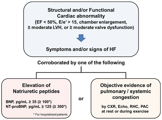 The recently proposed HF definition suggests that HF is a clinical syndrome with current or prior symptoms and/or signs caused by a structural and/or functional cardiac abnormality (as determined by EF < 50%, abnormal cardiac chamber enlargement, E/e′ > 15, moderate/severe ventricular hypertrophy, or moderate/severe valvular obstructive or regurgitant lesion) and corroborated by at least one of the following: elevated natriuretic peptide levels; objective evidence of cardiogenic pulmonary or systemic congestion by diagnostic modalities, such as imaging (e.g., chest X-ray or elevated filling pressures by echocardiography) or hemodynamic measurement (e.g., right heart catheterization, pulmonary artery catheter) at rest or with provocation (e.g., exercise) [1] (Figure 1). NT-proBNP or BNP tests should be performed when HF is suspected based on risk factors, symptoms and/or signs, or abnormal electrocardiography. Supposing that the result is abnormal or the laboratory test is not available, further evaluation of the echocardiography needs to be performed to confirm the diagnosis of HF and classify the phenotype of HF according to the EF [3]. Finally, the etiology should be determined to establish the treatment strategy. The utilization of various biomarkers and multimodality imaging is helpful during the whole step of HF, including diagnosis through the future prognostication of the disease.
