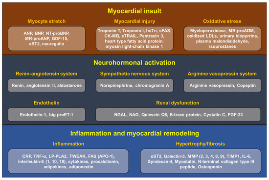 Biomarkers in heart failure according to the pathophysiological mechanism. ANP, atrial natriuretic peptide; BNP, B-type natriuretic peptide; NT-proBNP, N-terminal pro-B-type natriuretic peptide; MR-proANP, midregional pro-atrial natriuretic peptide; GDF-15, growth differentiation factor-15; sST2, soluble ST2; hsTn, high-sensitivity troponin; sFAS, soluble Fas cell surface death receptor; CK-MB, creatinine kinase-muscle/brain; sTRAIL, soluble tumor necrosis factor-related apoptosis-inducing ligand; MR-proADM, midregional proadrenomedullin; LDL, low density lipoprotein; proET-1, proendothelin-1; NGAL, neutrophil gelatinase-associated lipocalin; NAG, N-acetyl-β-D-glucosaminidase; FGF-23, fibroblast growth factor-23; CRP, C-reactive protein; TNF-α, tumor necrosis factor-α; LP-PLA2, lipoprotein-associated phospholipase A2; TWEAK, TNF-like weak inducer of apoptosis; FAS, Fas cell surface death receptor; APO-1, apolipoprotein-1; MMP, matrix metalloproteinases; TIMP1, tissue inhibitors of metalloproteinases1;IL-6, interleukin-6.