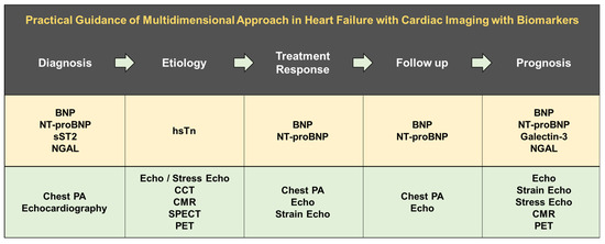Heart failure (HF) is a clinical syndrome caused by various etiologies, resulting in systolic and diastolic cardiac dysfunction with congestion [1,2,3,4,5]. Recent HF guidelines have classified HF into three categories according to the ejection fraction (EF): HF with reduced EF (HFrEF, EF ≤ 40%), HF with mildly reduced EF (HFmrEF, 40% < EF < 50%), and HF with preserved EF (HFpEF, EF ≥ 50%) [3]. The evaluation of HF requires additional information, including laboratory tests, electrocardiography, diverse imaging tests, exercise testing, invasive hemodynamic evaluation or endomyocardial biopsy [1]. Among these, multimodality imaging and cardiac biomarkers are the most frequently used methods for HF diagnosis and treatment. Recent developments in non-invasive imaging modalities can help assess the causes, pathophysiology, and hemodynamics of HF, determine treatment options, and predict outcomes. The role of biomarkers in HF has also been increasingly focused on [6,7]. Natriuretic peptide is the most important biomarker for HF diagnosis, evaluation of treatment response, and prediction of outcome [8,9]. Other cardiac biomarkers, such as myocardial injury, oxidative stress, inflammation, fibrosis, hypertrophy, and neurohormonal activation, are being introduced regularly to assess the pathophysiological mechanisms of HF [6,10,11,12]. Because HF is a caused by complex cardiac disorders, it is critical to assess heart condition multidimensionally to improve patient management [3,5,13]. In this review, we describe a multidimensional approach using various imaging modalities and multiple biomarkers in HF management for risk stratification, diagnosis, etiology evaluation, treatment, and prognostication.