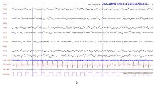 The first cycle of carboplatin (area under the curve (AUC) of 5) and etoposide (100 mg/m2 daily on days 1–3) with a combination of an ICI (atezolizumab at a dose of 1200 mg on day 1) was delivered without immediate side effects. Nevertheless, the following day the patient presented consciousness disorders (a Glasgow score of 5/15) associated with a partial epileptic seizure (tonic-clonic seizure of the right upper limb), that was secondarily generalized. The partial epileptic seizure persisted despite optimal management with the administration of clonazepam and levetiracetam. Therefore, the patient was transferred to the intensive care unit (ICU) where he received phenytoin and corticosteroids. His arterial blood pressure was elevated (206/108 mmHg), with increased heart and respiratory rate but without fever. On neurological examination, he demonstrated a right hemiplegia, a facial paralysis of the right hemiface and a right pyramidal syndrome. Glycemia was normal. The electroencephalograms performed on the first and second day of the symptoms are shown in Figure 1.