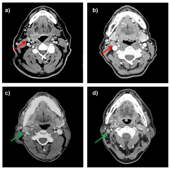 Axial contrast-enhanced CT scans of HNC patients clinically staged as neck lymph node positive who were histopathologically negative and who could be rejected from postoperative irradiation (upper row). In the lower row, CT scans of patients who were actually histopathologically positive and who had postoperative irradiation (lower row). Red arrow indicates cervical lymph node overstaging. Green arrow indicates true positive lymph node staging: (a) A 62-year-old male patient with a cT2cN2bcM0 oropharyngeal cancer treated with lateral pharyngotomy and neck dissection; (b) A 61-year-old female patient with a cT2cN2bcM0 supraglottic laryngeal cancer treated with transoral resection and neck dissection; (c) A 54-year-old male patient with a cT2cN2bM0 (pT2pN1) oropharyngeal cancer treated with transoral resection, neck dissection and PORT; (d) A 57-year-old male patient with a cT2cN2cM0 (pT2pN2c) supraglottic laryngeal cancer treated with transoral resection, bilateral neck dissection and PORT.