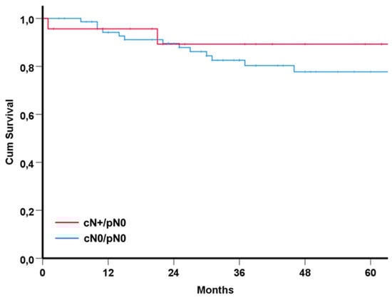 Kaplan–Meier plots of 24 patients with originally planned surgical tumor resection, therapeutic neck dissection and PORT (red line), in whom treatment was finally de-escalated to surgery alone (cases), and patients staged as cN0 (blue line) who were a priori scheduled for primary surgical resection with elective neck dissection only (controls; n = 72; log rank p = 0.74).